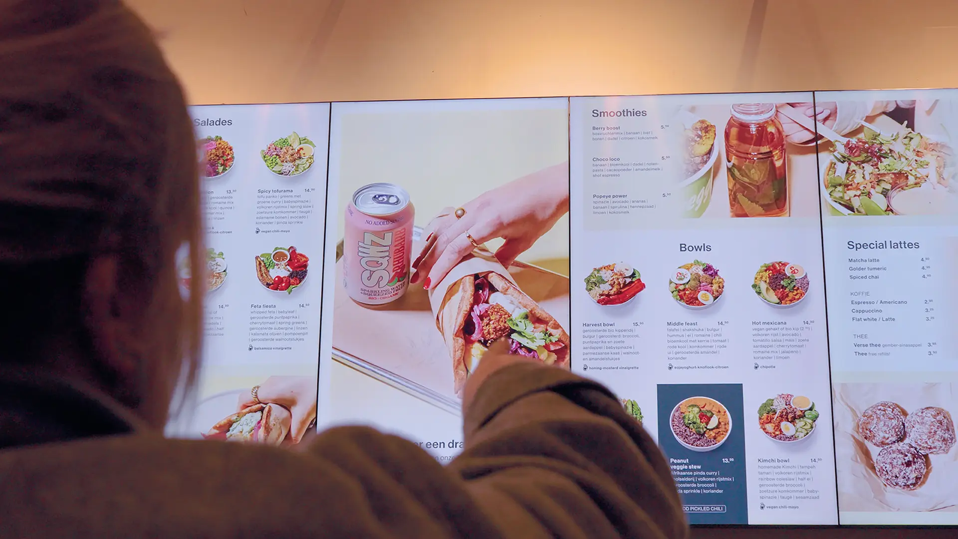 Skippify leverde Smart Menuboards die centraal worden beheerd via Skippify Suite. Menu’s, ingrediënten, seizoensproducten en prijzen worden realtime geüpdatet. De menuborden tonen duidelijk alle opties van vegan tot premium proteïne, in een visueel frisse, herkenbare stijl.